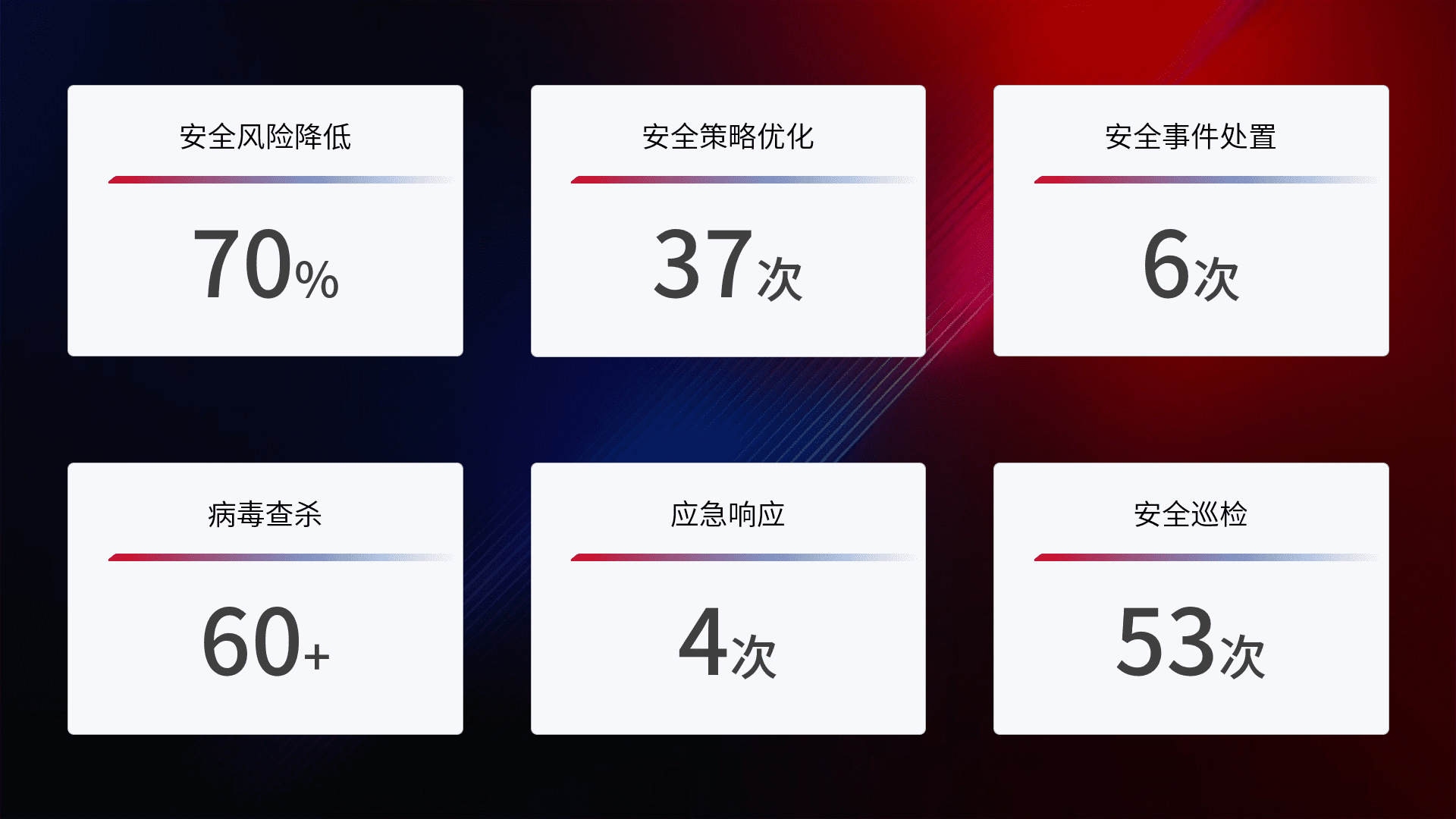 提供全面的安全事件报告体系,,,,包括处置报告、、、周报、、、、季度和年度总结,,结合持续监控,,,帮助客户深入了解网络安全状况。。